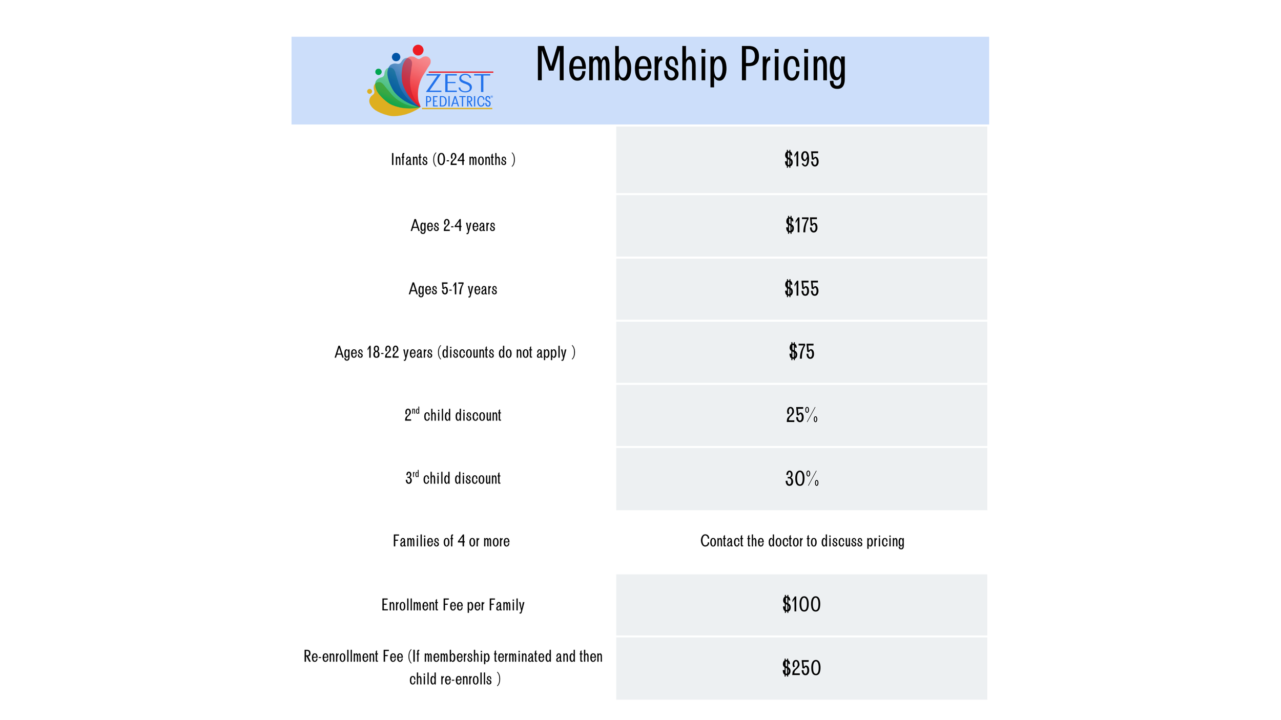 One of our goals at Zest Pediatrics® is to make medical care as transparent as possible. This means no surprise medical bills. Unlike Insurance based medical care, our payment structure is simple. Based on the size of your family and ages of your children, your family is charged one monthly rate and that includes everything that our doctors do for you at the office. No co-pays for appointments or surprise charges for in office labs or forms. Just one straight-forward, simple monthly charge.