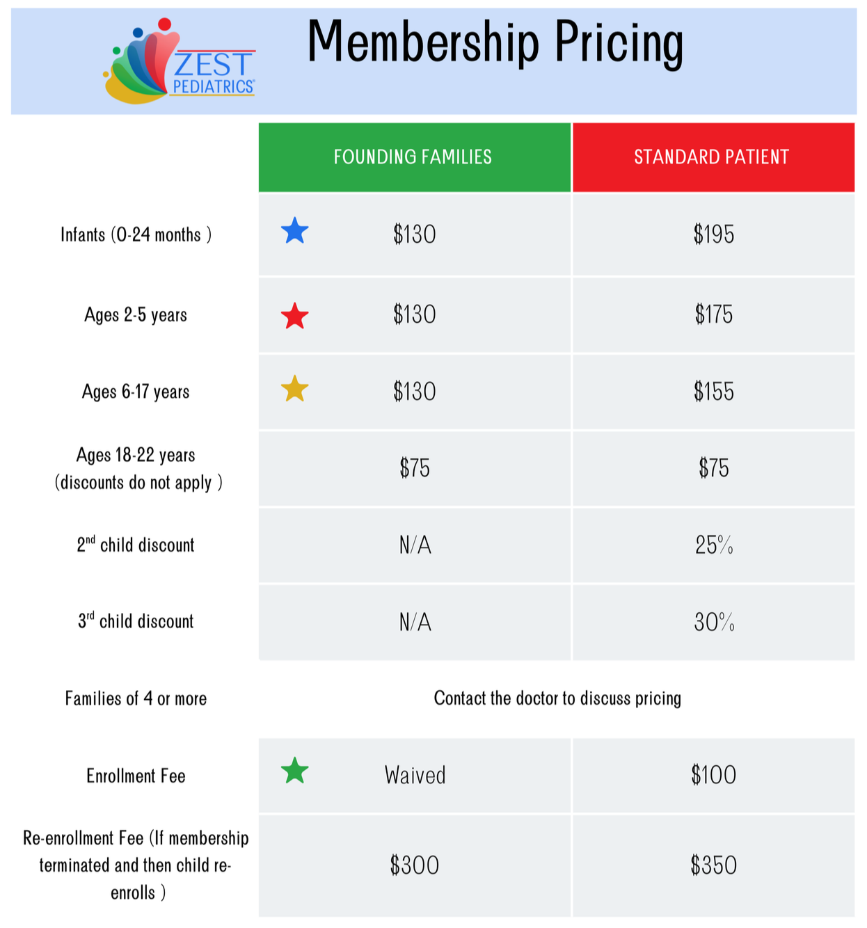 One of our goals at Zest Pediatrics® is to make medical care as transparent as possible. This means no surprise medical bills. Unlike Insurance based medical care, our payment structure is simple. Based on the size of your family and ages of your children, your family is charged one monthly rate and that includes everything that our doctors do for you at the office. No co-pays for appointments or surprise charges for in office labs or forms. Just one straight-forward, simple monthly charge.